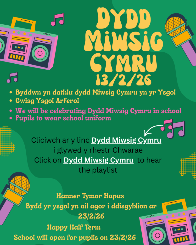 13.2.26 YFORY / TOMORROW 12/02/2026 Dydd Miwsig Cymru yfory – Gwisg Ysgol fel yr arfer ‘Welsh Music Day’ Tomorrow – School Uniform as usual Dydd-Miwsig-Cymru.pdf