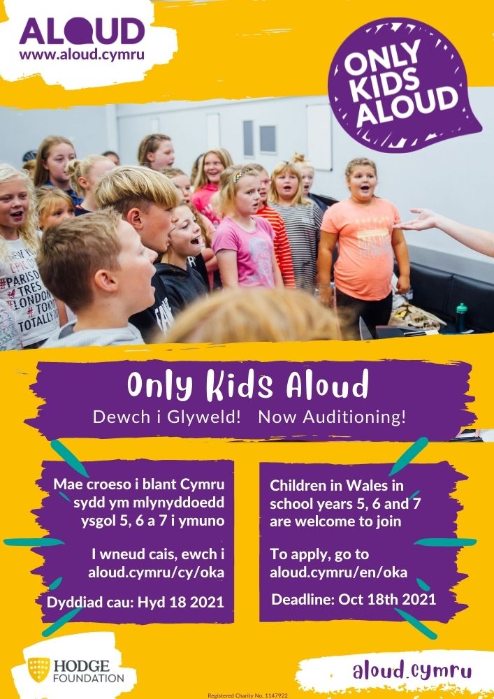 P’nawn da. Hoffwn dynnu eich sylw at gyfle i blant oed 9-12 o bob cwr o Gymru i ymgeisio i fod yn aelodau o gorws Only Kids Aloud. Rydyn ni’n recriwtio aelodau i ffurfio côr newydd sbon ar gyfer 2022, i ddatblygu sgiliau cerddorol, i gynyddu hyder ac i fod yn rhan o gymuned hwyliog a chefnogol. A oes modd rhannu hwn efo rhieni / warchodwyr os gwelwch yn dda? Byddai’n ffantastig pe bai’r côr yn cynnwys aelodau sy’n cynrychioli eich ysgol chi! (Rwyf hefyd yn amgau fersiwn pdf o’r pamffled). Diolch o galon.