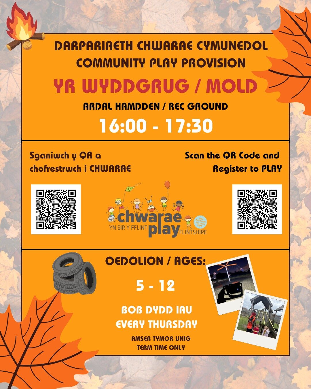 Yr Wyddgrug! Rydyn ni’n dod atoch chi! Cofrestrwch eich plentyn yma ar gyfer ein Darpariaethau Chwarae Hydref: