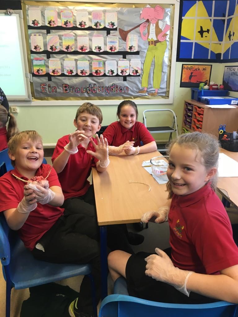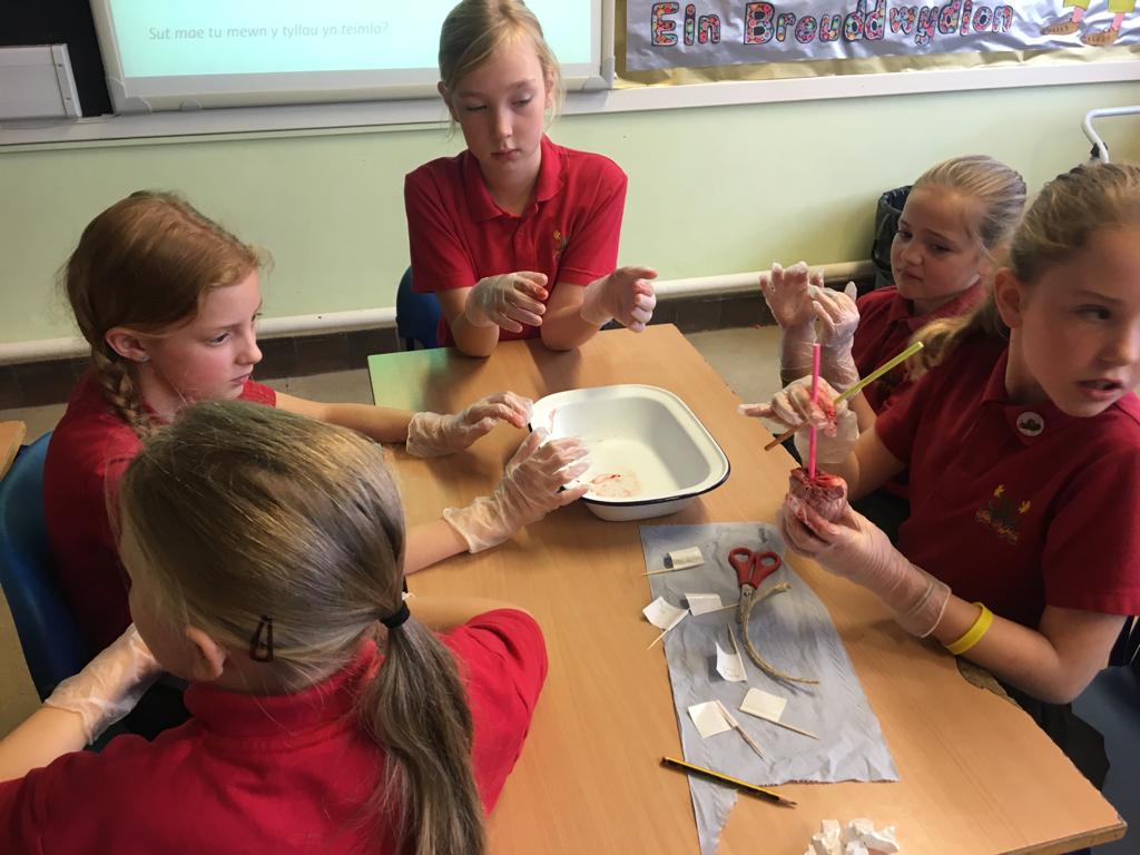 Roedd y disgyblion yn dysgu mwy am y galon mewn gweithgareddau ymarferol – yn labelu rhannau, yn defnyddio llinyn i ganfod pa diwbiau oedd yn gysylltiedig ac yna yn ei thorri i adnabod y gwahanol siambrau. Lot o hwyl a thrafod!