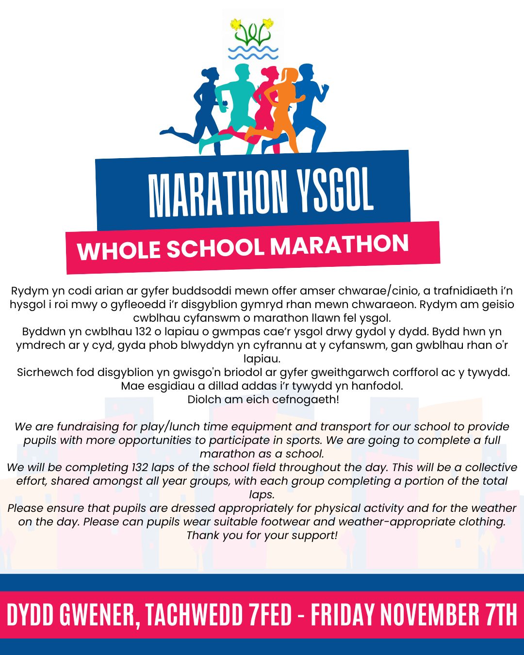 Rydym yn codi arian ar gyfer buddsoddi mewn offer amser chwarae/cinio, a trafnidiaeth i’n hysgol i roi mwy o gyfleoedd i’r disgyblion gymryd rhan mewn chwaraeon. Rydym am geisio cwblhau cyfanswm o marathon llawn fel ysgol.