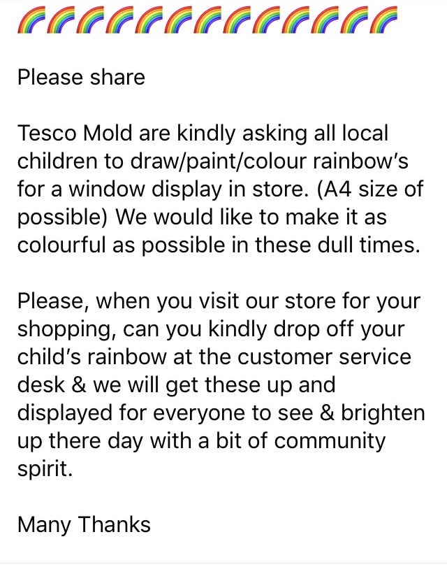 Tesco Yr Wyddgrug 15/04/2020 Tybed gall blant Glanrafon helpu? We wonder if Glanrafon children can help?